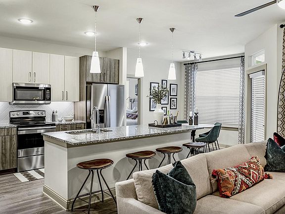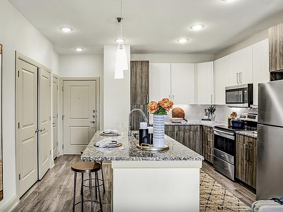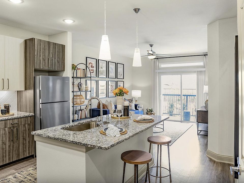 Expansive living areas Foyer coat closets Designer interior details Luxury kitchens with granite countertops Tile backsplashes Kitchen islands Under cabinet lighting Stainless-steel appliances Stylish wood-grain flooring Spacious walk-in closets Large bathrooms with ceramic tile Walk-in showers * Garden-style soaking tubs * Full-size washers and dryers Private patios and balconies Pool and courtyard views * High-speed internet and entertainment package Attached car garages