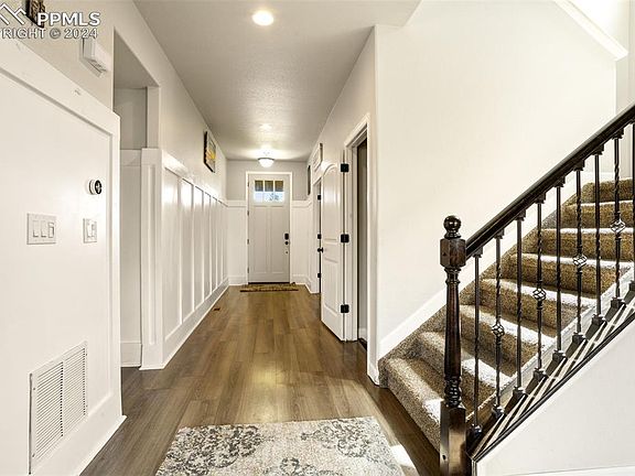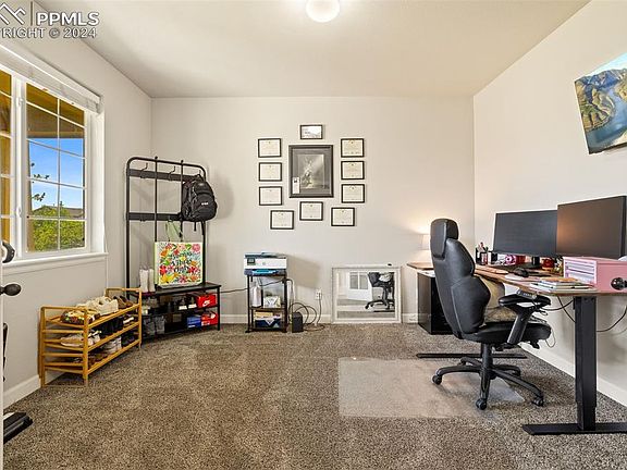 Welcome to Your Dream Home in Banning Lewis Ranch!This stunning 6 bedroom,4 bathroom retreat features an oversized 3-car garage perfectly situated on a spacious corner lot in a serene cul-de-sac,ideal for outdoor games and family gatherings.Upon entering,you'll be greeted by trendy accent walls guiding you through the home on luxury vinyl plank flooring with an abundance of natural light.The main level showcases an open concept layout seamlessly connecting the family room,dining room & kitchen.French doors lead you to the separate office space,ideal for remote work/study.The heart of this home is the beautifully updated kitchen,with updated Samsung stainless steel appliances,granite countertops,oversized island,breakfast bar & modern cabinetry—a warm and inviting space for culinary creativity.Additional updates include a whole-house humidifier, water filtration system,new carpet,fresh paint,exterior cameras, new garage door and back sliding glass door that enhances both functionality and style.Upstairs,the expansive primary bedroom offers breathtaking views of Pikes Peak and a luxurious five-piece bathroom with a large shower and relaxing garden tub.3 additional bedrooms,expansive loft and a full bath complete the upper level,featuring updated designer tile and vanities in all bathrooms for a fresh,modern look.The finished basement serves as an entertainment hub,featuring a large family room,two extra bedrooms,and another full bathroom—perfect for hosting guests or family fun.Step outside to your own backyard oasis, situated on one of the biggest lots in Banning Lewis steps away from the recreation center,parks and school.Banning Lewis Ranch offers an exceptional lifestyle with amenities including an award-winning school,parks,trails,pools, a gym,and a recreation center.Incredible Assumable-Rate opportunity!Don’t miss the chance to make this beautifully updated home yours schedule your tour today and imagine the possibilities in this welcoming community!