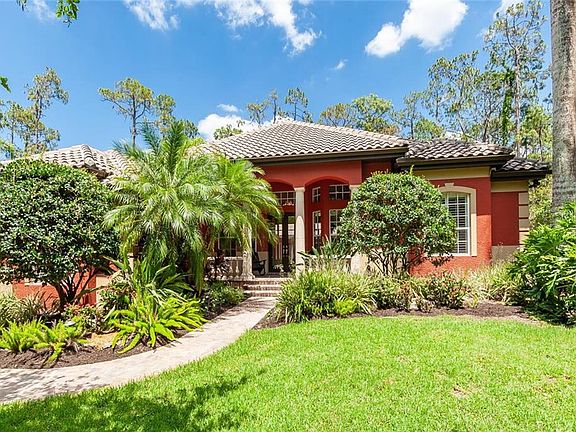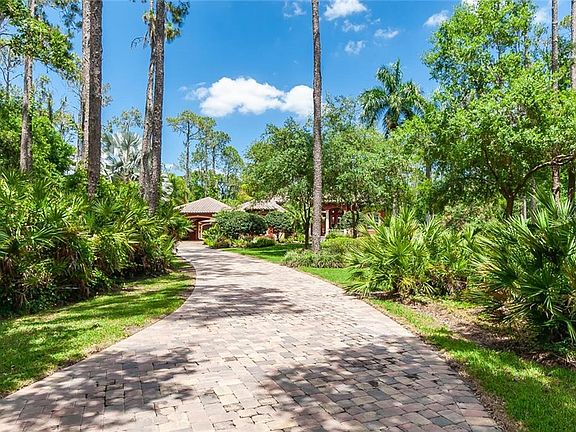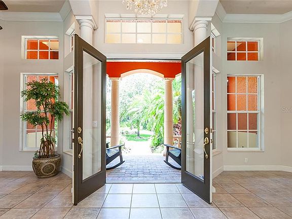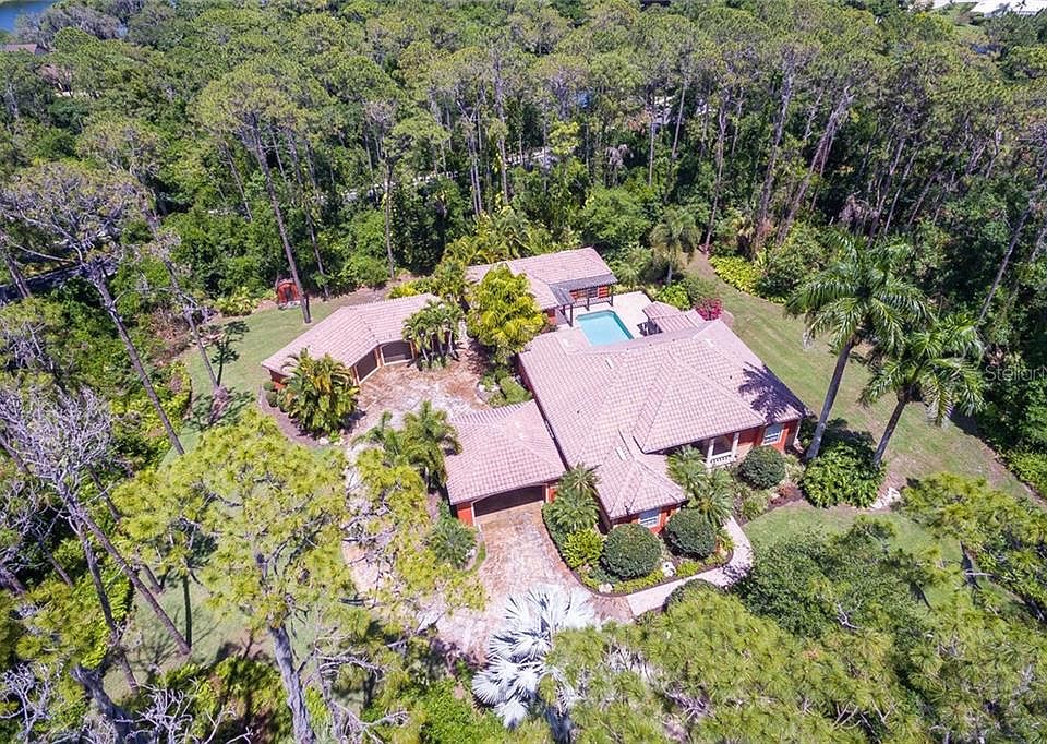 Absolute serenity in this Jonas Yoder built, multi-generational home. As you cruise up the beautifully pavered winding drive, a lush, mature & professionally landscaped garden greets you along with serene sounds of our Florida birds and the large water feature trickling in the courtyard. Only a mile past I75, but suddenly you feel the tranquility of the space being nestled on 2.5 acres of picturesque Florida Woodland. The front entrance hosts grand columns and an impressive & very convenient large arched porte-cochere. Through your double glass paneled front doors, guests are greeted with views of the open courtyard, crystal blue pool, and flourishing green backdrop. The main home wraps around the courtyard with the master suite wing residing on one end, the social rooms on the other end, while the detached guest home shares the north end. The main home offers 2 bedrooms, a formal living room, family room, a great Chef's arena, and a screened patio to relax year-round. Exceptional quality finishes throughout include crown molding, granite counters, wood cabinetry, stone columns, medallions, aquarium glass, plantation shutters, & custom built-ins. The fully-equipped guest home is a very comfortable 1,437sqft that includes its own formal entrance, full kitchen, family room with sliding glass doors to the pool, private back patio with a hot tub, laundry, & bedroom. This is a truly unique home with a great use of space on an significate portion of land that can accommodate a great variety of situations.