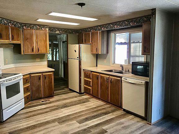 Double wide home on land with carport. Additional parking in front of home. Located on a cul de sac. It has 2 storage sheds to the right of the home and an amazing apple tree to the left of the home. A catatorium patio in back allows your cat to roam freely and safely outside. New electric water heater. Gas heat and a wood stove in the living room for chilly winters. New luxury vinyl flooring installed throughout the entire home. Large 15 x13 master bedroom with 2 closets. New LG washer and Samsung dryer stays! Antique and running ice cold Westinghouse freezer stays! 37” Vizio TV stays! Check out this house and make it yours.