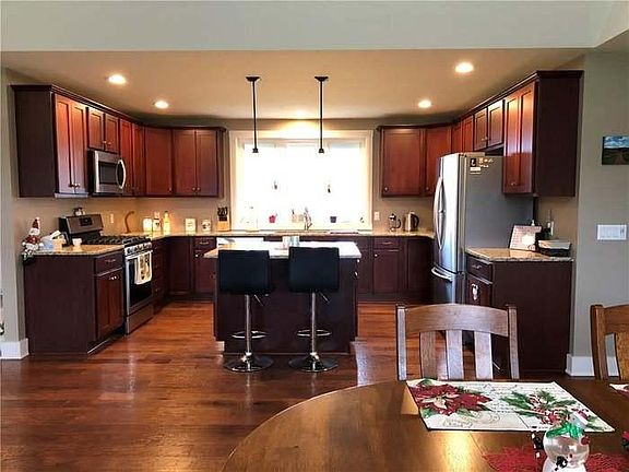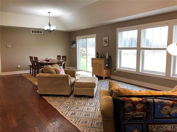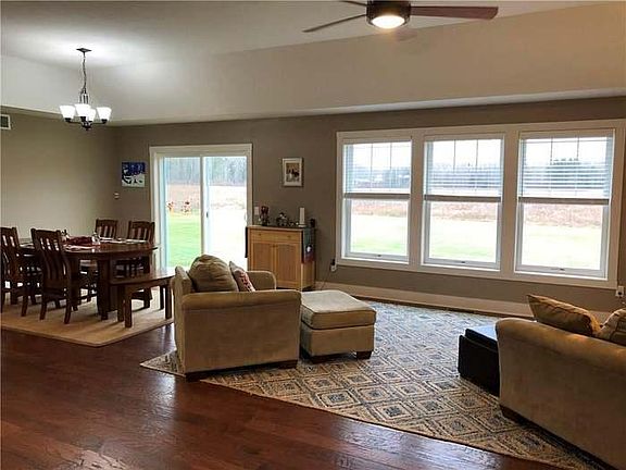 Better than new, 2x6 constructed custom ranch by Nowak with over $20,000 in improvements after construction including blinds, master shower door, shed, gas stove in lower level & finished garage. Open split bedroom floor plan. Large kitchen with Cambria counters, island with storage & seating, and stainless appliances. Ten inch trey ceiling in living and dining rooms. Wide plank hardwood floors in main living areas. Poured foundation with approximately 700 additional sq. ft. of living space in the lower level with 2 egress windows, one in the 4th bedroom with large walk-in closet. The 2nd egress is in the large finished family room with J0tul gas stove and pad. Outside is a 14x28 shed w/ tin roof & overhead door, a chicken coop w/ fenced area, and a fire pit all situated on 6.35 acres. Owner Pays For Light and Gas, Renter pays for Water