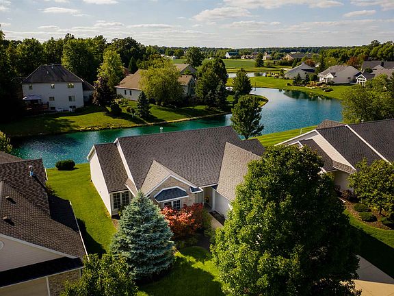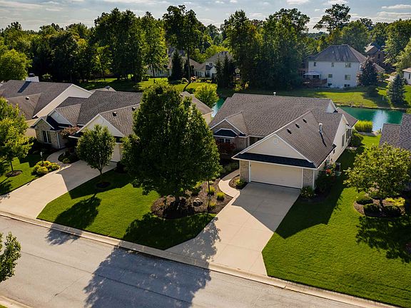 Custom Villa on a pond in the sought after Brooks Pointe section of Cherry Hill. Built by Colonial Homes by Delagrange, you will love the floor plan of this well maintained villa. Step into the foyer of this home and you will quickly notice the open beauty of the Living Room with dramatic windows overlooking the pond. Custom amenities include a gas log fireplace, beautiful crown molding and floor to ceiling windows with custom window treatments. Open Kitchen with island includes tile floors and backsplash, stainless appliances which are all included and a nice size dining area. Screened porch to enjoy the outside and the pond view is located just outside the Dining Area. Just off the foyer you will find a roomy den with french doors, the perfect spot for a home office or to relax with a book to read. Master Bedroom with trey ceiling and triple windows leads to the Master Bathroom with double sink vanity, separate garden tub and shower and the walk in closet. Second Bedroom with custom built in storage in closet and a second full Bath. Separate laundry room with built in storage above appliances and closet - washer and dryer are included in the sale. Two car detached garage. Recently replaced water heater. Low maintenance living close to Chapel Ridge and 469. Also convenient to the Lehman YMCA. Rare opportunity to make this villa in a beautiful villa neighborhood your next home.