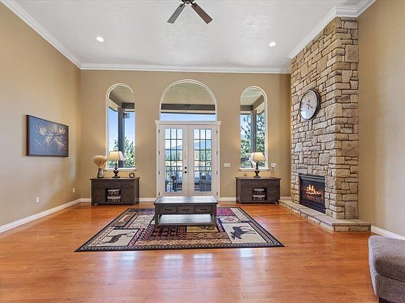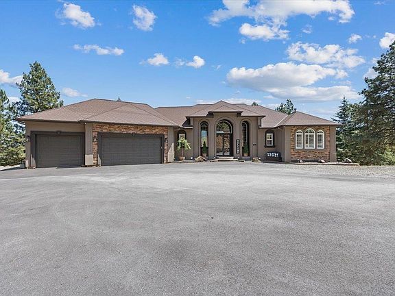 Nestled on 10 private, tree-covered acres in gated Saddle Ridge Estates, this stunning home blends luxury, comfort, and seclusion. Enjoy breathtaking views through floor-to-ceiling windows, a grand stone fireplace, and an open staircase. The gourmet kitchen features custom cabinetry, granite counters, island, and stainless-steel appliances. French doors lead to a large Trex deck with incredible views. The main-floor primary suite includes a jetted tub, tiled walk-in shower, dual sinks, and a custom closet. The daylight walk-out basement has 2 bedrooms, full bath, partial kitchenette, office/craft room, storage, and a spacious family room. French doors open to a fenced patio with hot tub, firepit, tree house, and more views. Extras: 3-car garage, RV parking, asphalt driveway, pad for future shop, shed, new exterior paint, new garage doors, new double-entry glass doors & two new 50-gallon hot water tanks. Just minutes from coffee shops, dining, 3 golf courses, and Liberty Lake.