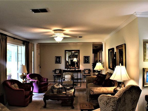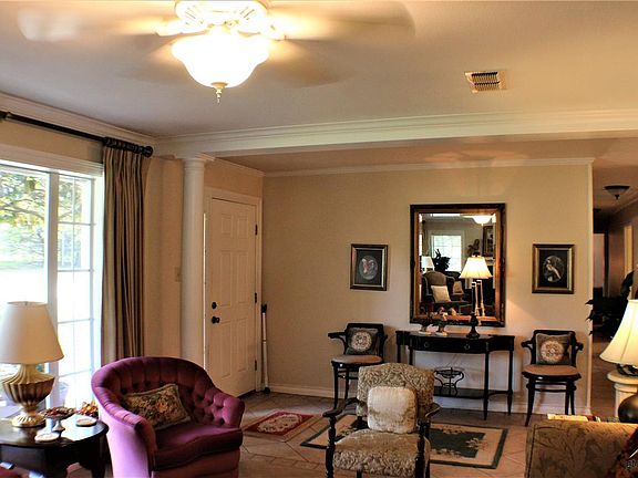 The charm of this home begins with the beautiful drive to the property, then the curving cement driveway to the home. Enter with a view of the living area with a fireplace and an abundance of windows for wonderful natural lighting. This area joins the dining with a view to the pond and goes on to the large, island kitchen with lots of storage and work space with a breakfast area. From here you can exit to the screened in porch, a great place to relax and enjoy the scenery. Down the hallway, you see the guest bedrooms and first bath. The oversized laundry room is versatile and has the 2nd bathroom, accessed in the corner of the room. Going back down the hallway, you see the small sitting area that leads to the den/office with a fireplace. This lovely room has built-in bookcases, high ceiling and private bath. The master bedroom is off this room with a private bath and ample space with a view of the court yard area and surrounding trees. The surrounding acreage offers a pond and is barbwire fenced.
