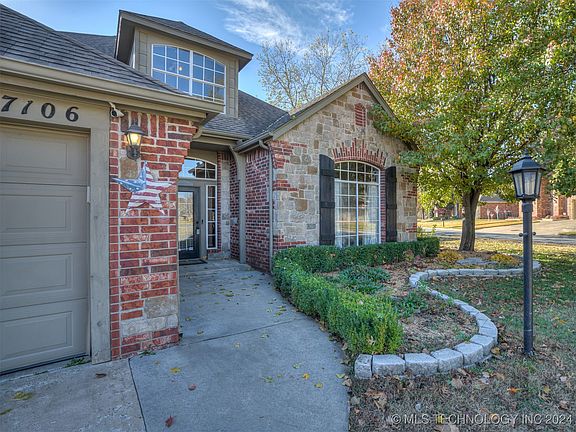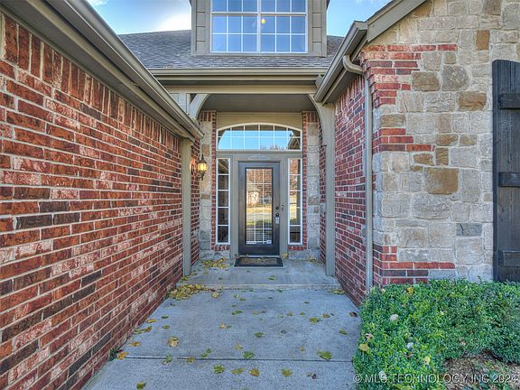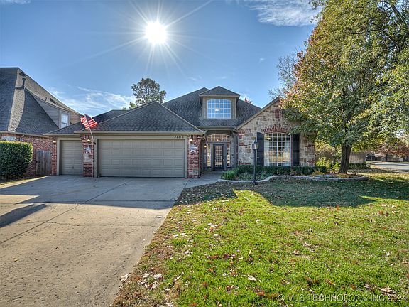 This 3414 SF Tulsa home is nestled on a beautifully landscaped corner lot in The Crescent neighborhood (Union Schools/Darnaby Elementary). Built in 2000 with contemporary colors, hardwoods and an open floor plan. Gather in the spacious living area, around the brick fireplace in the family room, or on one of the outdoor patios with pergola coverings. The main level also includes formal dining, breakfast nook, a sitting room/office, three bedrooms and two baths. Kitchen was updated in 2021 and features granite countertops, tile backsplash, built in double ovens, microwave, Jenn-aire gas cooktop with griddle, refrigerator, Bosch dishwasher, and convenient roll-out drawers in lower cabinets. The master suite offers a whirlpool tub, walk-in shower, double vanities and access to a storm shelter through the spacious walk in master closet. Additional bedroom and full bath upstairs, along with a spacious game room and walk-out attic. Outside, enjoy the outdoors on two outdoor patios with pergolas and a fully fenced backyard. New exterior doors, (French doors to side patio, and door to back yard) both have integrated blinds. New interior paint 2023/2024. Ceilings in living areas are 10 ft., and 9ft in the master bedroom. Custom cubbies in the foyer, alarm system, storage shed and storm shelter remain for Buyer at no additional cost.