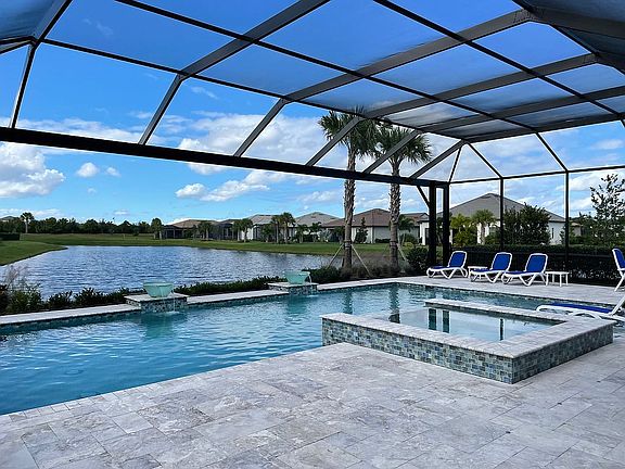 End of cul de sac, water on two sides, one of the most private lots in the community. Beautiful custom pool with sunset views! Oversized 3 car garage.