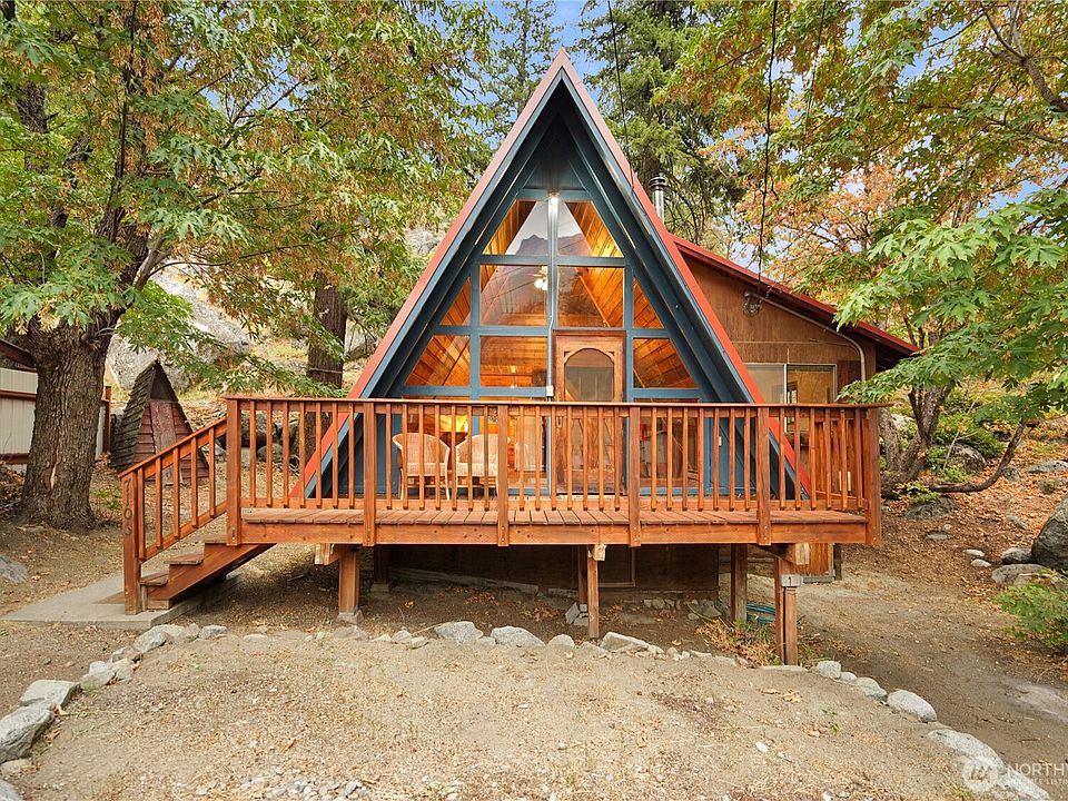 First time on the market in 30 years! This timeless Icicle River A-frame captures sweeping Enchantment views through dramatic windows that bring the mountains into your living room. The deck offers the soothing soundtrack of rushing water and the chance to spot mountain goats on the cliffs above. Inside, warm pine walls, a cozy wood stove, and a simple yet functional galley kitchen create the perfect mountain retreat. The main-floor bedroom enjoys its own alpine vista, while the bright loft provides comfortable guest space. Natural landscaping blends with the setting, complemented by a privacy rock wall and mature shade trees. Mere minutes from Leavenworth's Bavarian Village, this is true PNW charm.