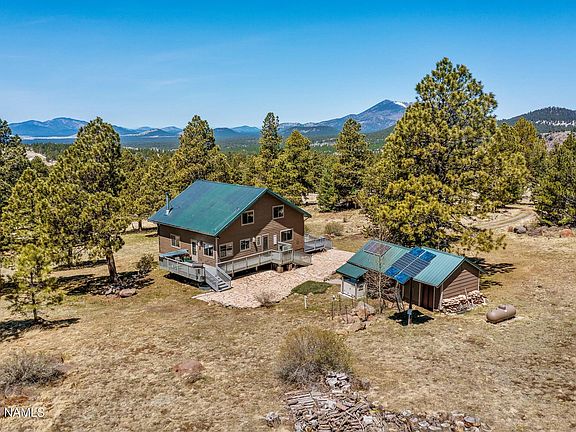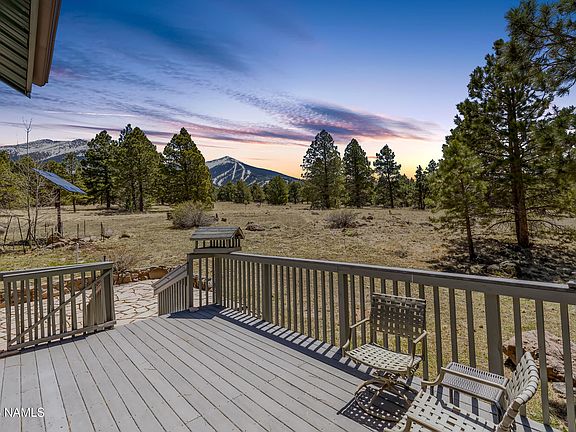 Experience the views of Agassiz, Humphreys, Kendrick and surrounding peaks from your wrap-around deck. Peaceful, serene, and unbelievable, this 2.71 acre custom built home is the crown jewel of Snowbowl Estates. Backing up to FS land with both Snowbowl and the Arizona trail...you're in the middle of where you want to be. Hart Prairie is a coveted area often featured on the news for its beautiful and breathtaking fall colors and calendar worthy views of the San Francisco Peaks. With 3 bedrooms plus a loft and 2 bathrooms spread across 2,040 square feet, there's plenty of space for family and friends to gather and create lasting memories. Inside, you'll find thoughtful touches throughout, including aspen tongue and groove ceilings, aspen wood trim, and dual-pane insulated aluminum frame windows. Never miss a sunset again as the west wall of expansive glass provides openness and natural light.Stay comfortable in any season with the soapstone wood-burning stove, providing slow-to-heat warmth and a cozy ambiance.