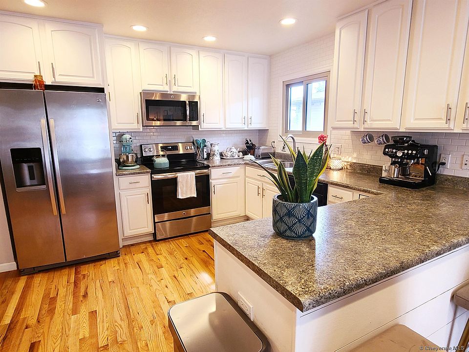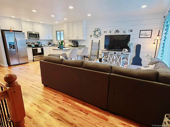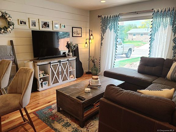 Gorgeous updated home located in North Cheyenne. This home features 5 bedrooms, 3 bathrooms and attached 2 car garage. With over 2,000 finished sq ft, hardwood floors, stainless steel appliances, central air, ship lap wall and wood shelves. Beautiful waterfall landscaping in the front yard and a spacious fenced in back yard for entertaining.