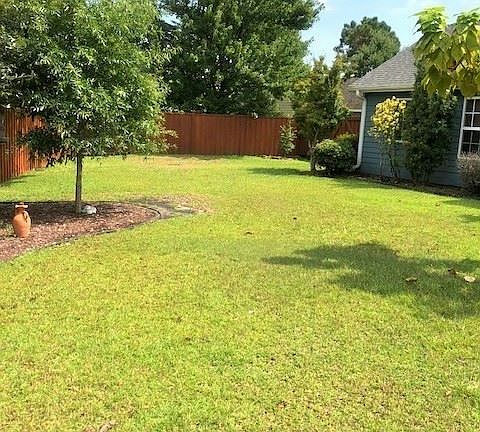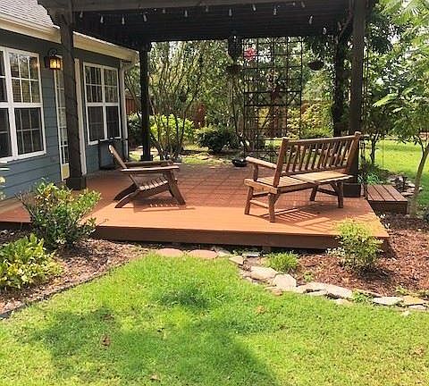 Three Bedroom/Two Bathroom home on one of the largest lots in Planters Walk and it is fenced in. New carpet in the guest bedrooms, tile floors in both baths, kitchen and dining room, bamboo flooring throughout great room, hall and master. Cathedral ceilings in the great room and master bedroom. Master bath has a large shower with double shower heads, double sink, and large linen closet. Kitchen has granite counter tops a breakfast bar. 2 car garage and a large 18x16 deck with beautiful pergola.