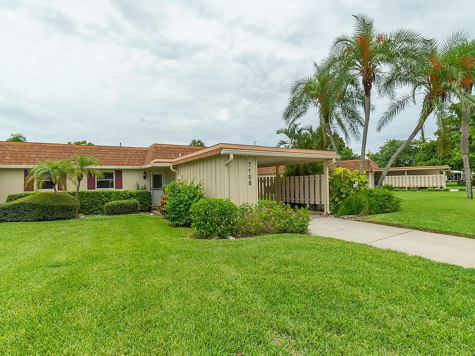 KITCHEN GRANITE AND KITCHEN BACK SPLASH NOW INSTALLED. Newly updated Villa located in Village Green with carport. Updates include all new electric plugs, tankless hot water heater, new fans, new blinds, new light fixtures, new interior and exterior paint, new trim, new cottage doors and hardware, new cabinet hardware, new dishwasher, new garbage disposal, new wood insert in kitchen ceiling, new wall A/C in lanai for 4-season comfort. A/C for home appears to have 3 year warranty left (please confirm). Move in ready to enjoy your retirement in this is 55+ community. Tile throughout except bedrooms. Green view out back lanai with pool just down the path. Village Green is off 75th Street West or Manatee Avenue, and close to Anna Maria Island and all the beach fun. Cul-de-sac location provides for a quiet and peaceful atmosphere to relax in while home and yet the community pool is just down the pathway. With over 1300 square feet of living space, and an enclosed lanai why not make this your place in the Sun. Palma Sola Bay, Anna Maria Island, shopping, hospital, and dining are all nearby. Not in flood zone. HOA fee of $360/month includes cable TV, community pool, internet, grounds maintenance, pool maintenance.