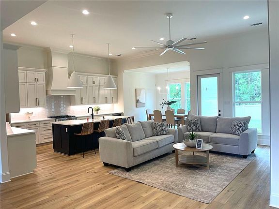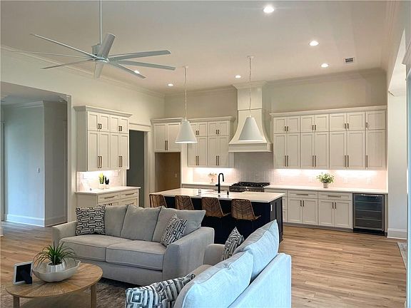 informal serving. Bar and pantry are nearby. The open dining area and living space has a