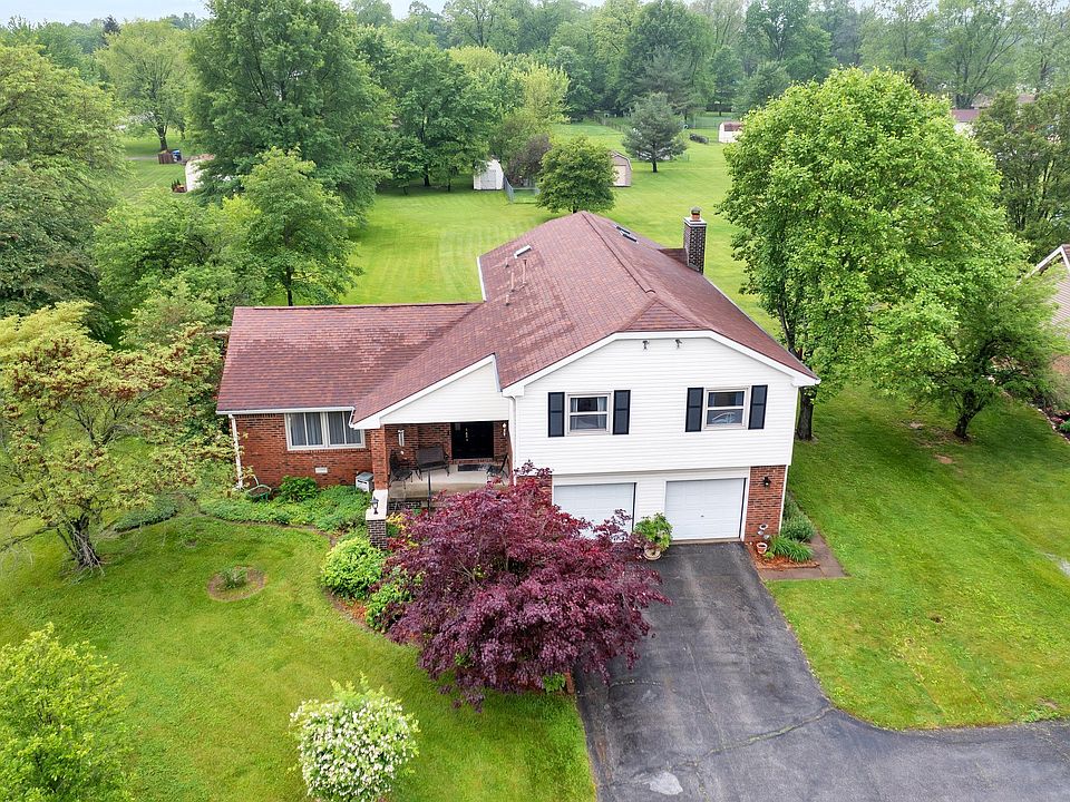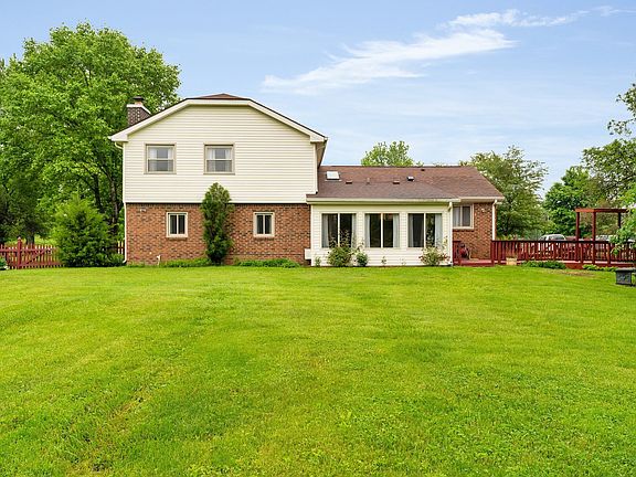 Step into comfort with this spacious 5-bedroom, 3-bathroom home situated on a sprawling 1-acre no HOA lot. A large entry welcomes you to the Living Room and don't miss the built-in bookshelves (the photographer did), Dining Room, and Kitchen. Half a flight of stairs down is the Family Room with fireplace and another eating area, pantry and full bath or walk out to the Sun Room currently used as an exercise room. Currently using 2 BRs as offices but 5BRs in total. Recent updates taken care of for you include fresh paint inside and a stained deck providing the perfect setting for outdoor gatherings and relaxation. Other updates include: new furnace and AC ensuring comfort year-round, a rebuilt chimney, rebuilt front decorative brick wall off the porch, updated laundry room, attic ladder, new light fixtures, new front door and garage door to house, vanity and toilet in the downstairs bath. There is also a fenced dog kennel next to the storage barn and there is a doggie-door entrance from the kennel to the barn and there is an invisible fence for a dog also.