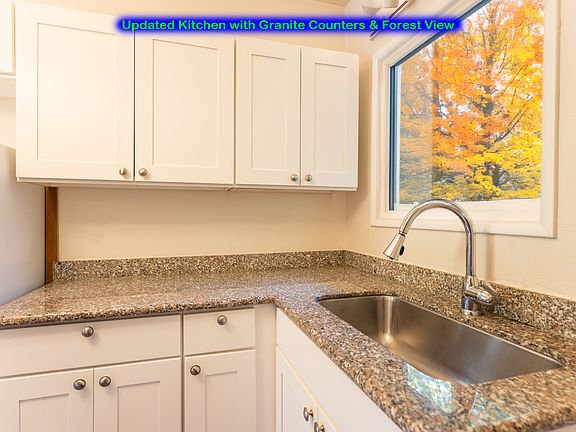 Modern faucetOpen living spaceTree-lined viewsBackyard patioUpdated sinkVaulted ceilingsGranite kitchen countertops
