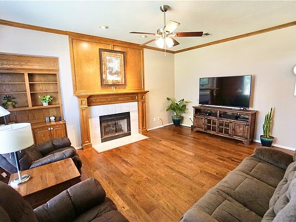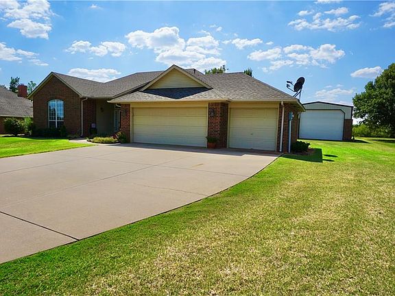 Located on a half acre in Oak Tree Estates, this immaculate brick home features 4 bedrooms & 2.5 baths. The house features hardwood floors in the living room & formal dining. The living has 10 ft. ceilings, a vent-less, gas fireplace & ceiling fan. The kitchen features plenty of cabinets & granite countertops w/ a stainless steel gas range w/ convection, dishwasher, built in microwave, pantry, built in desk & a breakfast bar & nook. The master suite has cathedral ceilings w/ a ceiling fan. It also features a Jetta tub, separate shower, double vanities & walk in closet with built ins. Other features include: granite in the 2nd bath, ceiling fans thru-out, walk in closets & a laundry room w/ counter space and storage. There is a 10 person storm shelter off the patio. Fenced & landscaped. Let's talk about the SHOP! This 24x36 RV/workshop is equipped with electric & 220 hook up! It will house a 32 ft. RV with ease. The 8x10 garden building next door is perfect for smaller equipment.
