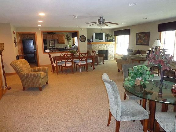 Pine Ridge Estates 3rd floor condo with excellent floor plan. Fantastic views from your windows of the trees and dry river rock flowing stream. All areas of property are beautifully landscaped. Enter the condo building through the secure front door or parking garage. Stop at the mailbox area in the entry and take the elevator up to the 3rd floor. Drive in parking garage has your own parking stall, car wash bay to clean your vehicle, personal storage area and exercise room. Enjoy the beautiful Alderwood cabinets with granite counters in kitchen and bathroom. Kitchen area has black appliances, stainless steel sink and garbage disposal. Recessed lighting, hexagonal tray ceiling, gas fireplace compliment the great room. Laundry room is equipped with washer and dryer. Master Suite has a full bath and spacious walk-in closet. French doors lead into your own 4-season room. The fantastic views continue through all rooms courtesy of the large almost floor to ceiling windows. A second room could be a non-conforming bedroom or office. Beautiful community room for guests and parties with full kitchen, fireplace and table and silverware service. Have a movie night party, birthday party or sign up to use the room for holidays. Association fee includes maintenance in the indoor common areas, care of landscaped property, water and sewage. Complete with a central vacuum system and sprinkler system. One small pet is allowed.