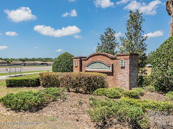 This beautiful corner lot home is nestled in the highly desirable Trillium neighborhood. The community's park and pool are right behind this 3 bedroom, 2 bathroom, 2 car garage home. As you walk through the bright well-lit great room, you'll admire the luxury carpet-less spacious open floor plan this home offers. The kitchen greets you with all of the desired upgrades. Featuring granite countertops, stainless steel appliances, large island/ breakfast bar, while providing additional seating separate from the formal dining area. The living room leads you out through a 3 panel slider, transitioning you to the oversized extended screened lanai. This unique extra space makes this home stand out from the rest, and can be made to be your personal oasis great for unwinding and to recharge. The fenced in yard provides privacy while you enjoy your space. The en suite tiled bathroom features a large soaking tub, separate walk-in shower, dual sinks, and a very impressive spacious walk-in closet! Conveniently located only minutes away from grocery stores, restaurants, amenities, and quick access to the Suncoast Parkway with Tampa only 40 minutes away. Don't miss out on this very well manicured home!