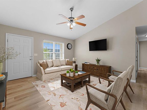 Immaculate ranch with a lovely level, landscaped yard that is nearly completely fenced. So simple to finish! BRAND NEW (2024) laminate plank floors & fresh paint in the main living areas, including the family room with tall vaulted ceilings. Updated lighting in the open kitchen, with space for your table & chairs, and an atrium door that opens to the patio, ideal for indoor/outdoor entertaining. BRAND NEW (2024) carpet in all bedrooms, including the primary suite with its own private bath. Handy main floor laundry. Excellent storage space (built-in shelving included) in the lower level with a roughed-in bath, or easily finish to add more living space. You will love the 9' bump-out in the garage w/built-in workbench. Ring doorbell & Ecobee smart thermostat included. Offering easy access to I-70 & great shopping, dining, and conveniences, yet tucked away from the traffic & noise. Just 10 miles from Wentzville's amenities. Move-in-ready, fresh and clean! Such a great home! See it today!