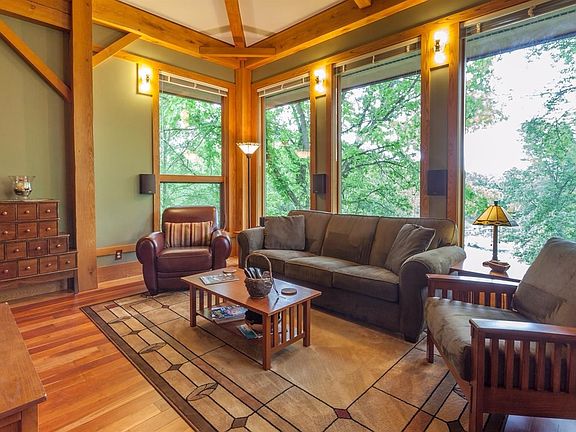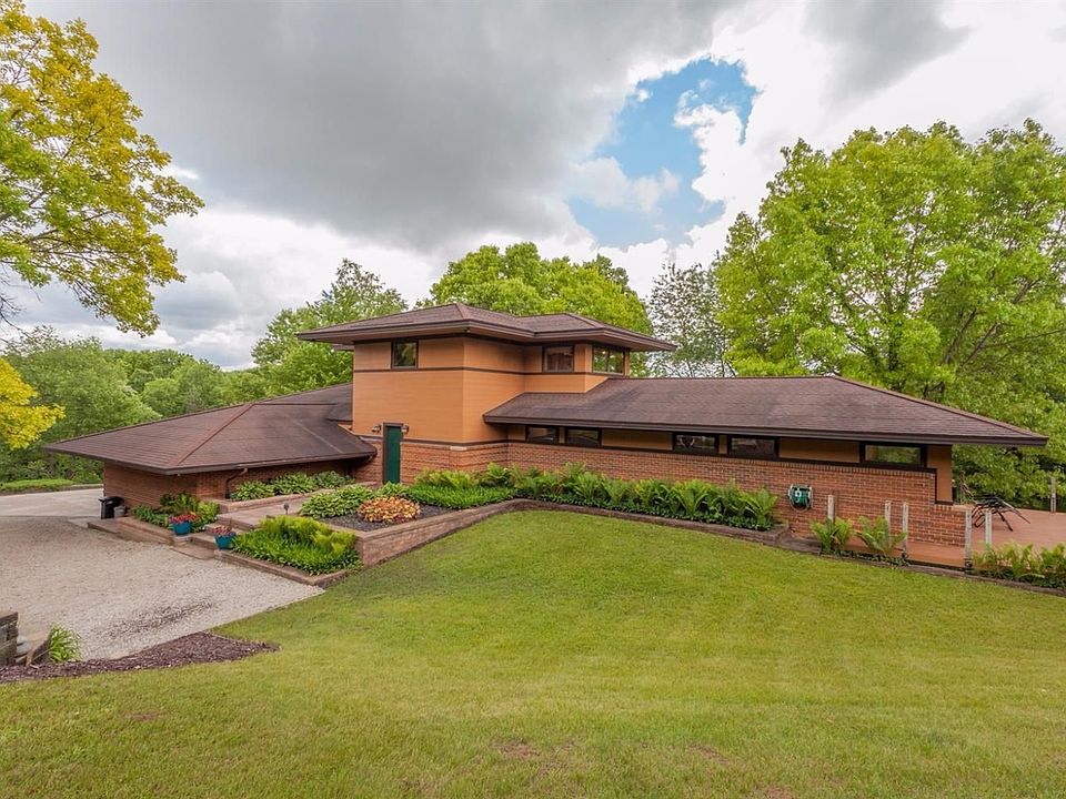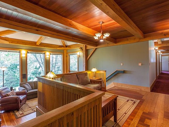 Just outside of Chelsea, on a country cul-de-sac, this custom home sits at the end of a long, winding driveway on a gentle hilltop. Surrounded by 42 acres of untouched nature, this Frank Lloyd Wright inspired home has post and beam construction, it is super-insulated, and has passive solar and geothermal systems, too. With a unique floor plan, this home boasts an independent spirit and a whimsical personality! Highlighted by warm wood tones throughout and large windows that invite the outside in, the main level features a large kitchen and adjacent dining room with space for a crowd, formal living room, and separate bedroom wing with 2 bedrooms, full bath, and sitting or homework area. The upper level plays host to a master retreat and private office with tree-tops views, and the lower level has family room, bedroom, full bath, sitting room, and huge projects room, where things get done! It has 2.5 attached garage plus 1 car detached garage/workshop.
