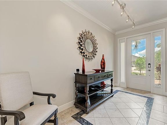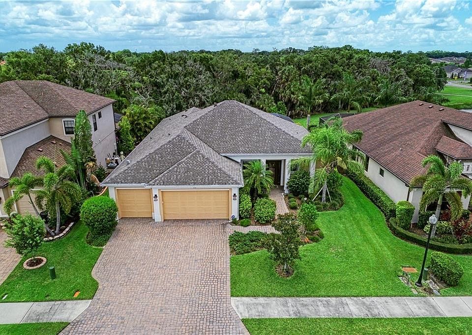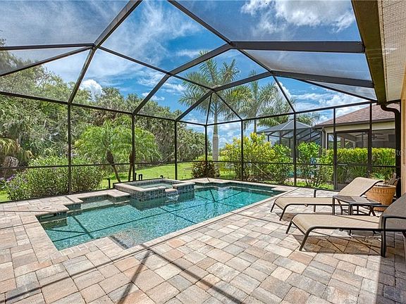 Located in the desirable gated community of Greyhawk Landing. This lovely one-story home, built by Sam Rodgers in 2014, has a wonderful private lot with both trees and water view. The popular Magnolia floorplan is perfect for today's living. Offering a spacious great room, open to the kitchen with a breakfast area and dining room. The owner's suite is front to back and has two generous sized walk-in closets and a accessible walk-in tiled shower, dual sinks, private water closet and a door to the lanai. The split bedroom plan features two bedrooms sharing a Jack-and-Jill bath with tub, and a 4th bedroom with nearby bath and shower that is easily accessed from the bonus room and pool deck. Other notable features include 8' doors, crown molding, quartz counter tops, tankless hot water, natural gas cooking and dryer, and water filtration system. You will surely enjoy lots of family time or entertaining guests while sitting by the heated pool or barbecuing a great meal in the outdoor kitchen. All of this and living in a fabulous community that offers amazing amenities such as resort-style pools with water slide, fitness center, tennis courts, fish-stocked lakes, walking trails, basketball, soccer field and playground. If you are looking for other adventures take a short drive to Lakewood Ranch Main Street, University Town Center, Benderson Park and more. Excellent school district too! Call today and don't let this opportunity pass you by.