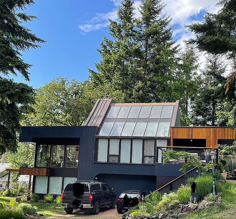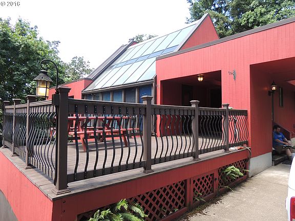 Beautiful and alluring contemporary home with 4 bedrooms, 2.5 baths. Brazilian cherry hardwoods in master with jetted spa tub. Oak floors elsewhere. Covered deck and backyard paved patio. Deck balcony looks out on nicely landscape private backyard. Commercial grade PVC roof, cedar siding. Loads of light and big windows. Skylights. New paint in some rooms. 2 car garage with side shop area. Central air.