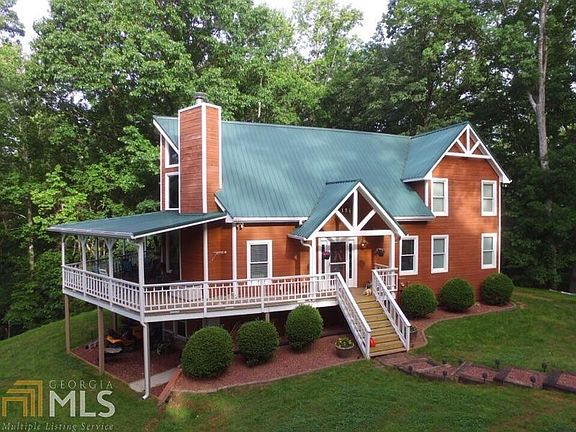 Mountain top views in a private wooded setting. This home is located only minutes from town shopping but feels like you could be in the North Georgia Mountains. The main floor features exposed beams in the high vaulted ceilings with massive timber frame construction. Livingroom and dining area have breathtaking picturesque views of the surrounding mountains and abundant wildlife. The kitchen features new custom cabinets with granite counter tops and matching island with lots of storage. Upstairs, the master has granite vanity with double sinks with waterfall faucets.