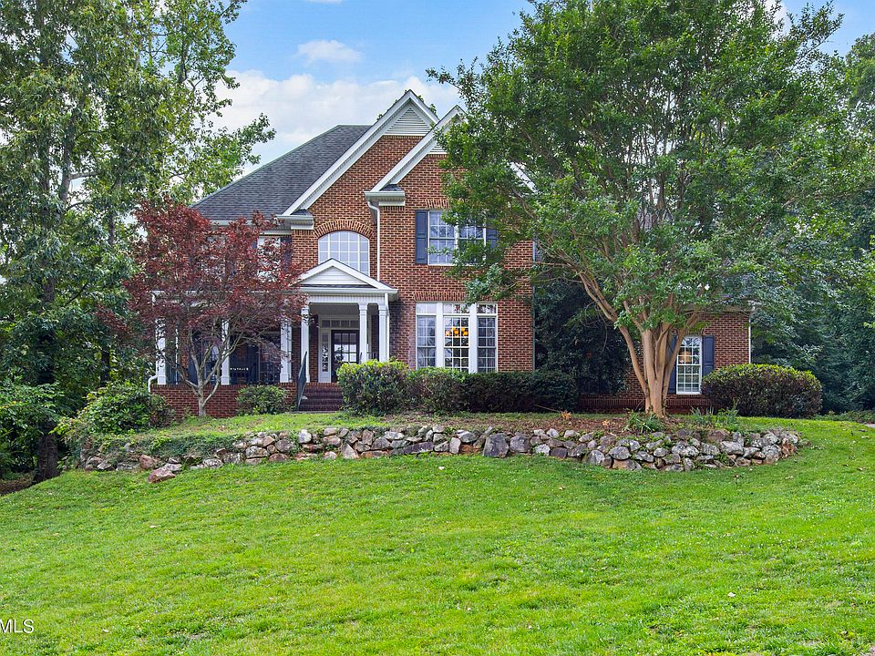 front porch, shutters, screened in porch overlooking a large private backyard with firepit nestled in the woods and a 3 car garage. Upstairs
