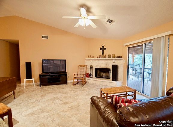 Feed the deer from this 1 acre piece of Hill Country tranquility. Only been used as a vacation home so it's gently used, jetted tub, covered deck, huge granite breakfast bar, open floor plan & oak trees galore. Storage shed & a 2car garage, located seconds from lake & golf course, grocery & restaurants & w/in 25min. of N. San Antonio amenities. Beautiful wood-burning limestone fireplace w/ ceramic tile throughout all the high traffic areas. Brand new carpet & granite counters, furniture/tv's are negotiable