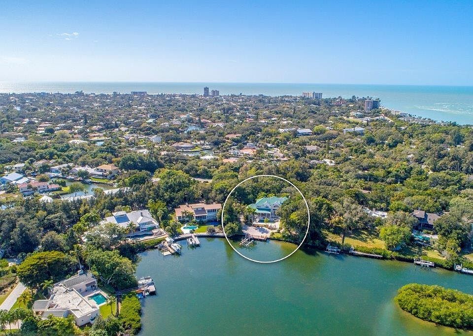 NEW PRICE! Poised on the secluded and coveted South Cocoanut Bayou on the bayside of Siesta Key, this one-and-a-half-acre estate offers 160' of direct waterfront splendor. With serene bayou views, the four-bedroom home creates warm environments of seaside elegance coupled with spectacular outdoor areas and a lifestyle dedicated to boating and nautical enjoyment. Soaring ceilings, white oak floors, pecky cypress ceiling and wall details, three fireplaces, and a kaleidoscope of natural light create hallmarks of coastal style. The professional-grade kitchen is paired with broad water vistas and features center island, quartz surfaces, stainless steel appliances, double sinks, and gas cooktop. Dine in the eat-in kitchen, covered outdoor lanai, or formal dining room with tray ceiling, chandelier, and stylish décor for any festive occasion. An office features cherry wood built-ins. The master suite embodies coastal elegance with built-in entertainment center, fireplace, and spacious master bath with soaking tub, walk-in shower, dual vanities, and high ceilings. Three additional bedroom suites provide privacy for all while an upstairs bonus room adds to the private spaces. A wealth of outdoor rooms, including summer kitchen, covered lanai, sundeck, porches, and terraces embrace the Florida lifestyle. Relax in the sparkling pool and spa. A dock with lift accommodates larger watercrafts and open miles of sparkling waterways. Private beach access for spectacular sunsets!