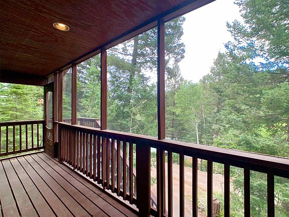 Single level newer village home is hidden atop the lot behind aspens & firs. No step entry through double garage & enclosed ramp. Wood laminate & tile flooring throughout, no carpets. Stone gas fireplace & forced air heat. Large master suite with connecting study or bedroom #4. Good inside storage, mud room has pantry. Storage & mechanicals underneath. Front screened porch has tree top views. Back partially fenced pet yard. Good parking with paved driveway & street. Offered with most furnishings.