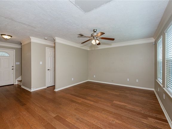 Spanning over 1,500 square feet, the interior is thoughtfully designed. The upper level features a split floor plan with all three bedrooms, including a primary suite with an ensuite bathroom, a second full bathroom, a flexible bonus living area, and ample storage closets. Downstairs, an open-concept layout creates an inviting space, complete with a half-bath for guests, an elegant archway into the dining room, and a spacious kitchen boasting granite countertops, abundant cabinetry, and views of the backyard.
