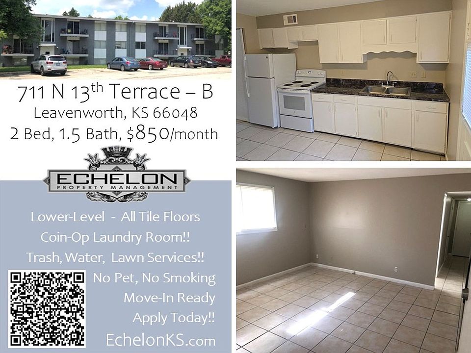 Lower Level, Move-In Ready Apartment, 2 Bed, 1.5 Bath!! Kitchen includes a Dining Nook, Fridge, and Oven/Range. Tile Floors throughout!! Minutes away from Fort Leavenworth, Downtown Leavenworth, Lansing, and the Greater Kansas City Area. Coin-operated laundry room in building common area for your convenience. Water, Trash, and Lawn Services PROVIDED!! No Pet. No Smoking.