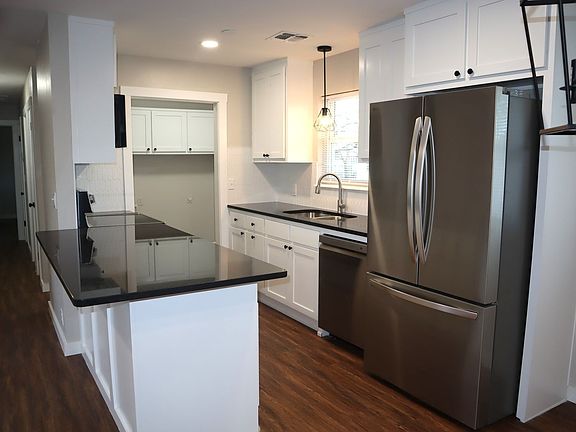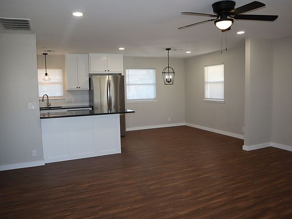 This home has the look and feel of new construction! You can be the first person to occupy this property since it's total renovation and upgrade! The wall between the kitchen and living room was removed to open up the floor plan. New LVP flooring runs throughout the house. All sheet rock has been retextured and repainted. The entire kitchen is brand new with custom cabinets, granite countertops, tile backsplash and under cabinet lighting. A spacious eating bar joins the kitchen to the living room and it also has a cute adjoining dining area. All of the light fixtures and ceiling fans in the house have been updated. New insulation was installed in the attic and all of the metal windows were replaced with vinyl replacement windows for additional energy efficiency. The hall bathroom has a new vanity with granite counter and undermount sink. The mirror above has perimeter lighting that can be controlled with a touch of the mirror to change light settings. All interior doors and hardware have been replaced. All three bedrooms are evenly sized and all have great closet space. The half bath off the primary bedroom has new lighting & storage and a charming sliding barn door. The kitchen has high end LG stainless appliances including a counter depth French door refrigerator with internal water dispenser & icemaker; a self cleaning LG electric range with 5 radiant burners, with convection and air fry features built in! Above it is a built in LG 1000 watt microwave with 300 CFM exhaust. The fenced backyard has beautiful mature trees and a great storage building/shop with concrete floor and covered patio. The backyard looks out into school yard of the Tom Stafford Elementary school. If you value 'nice', you'll want to check this one out! Of course, good rental references will be required.