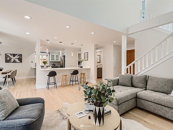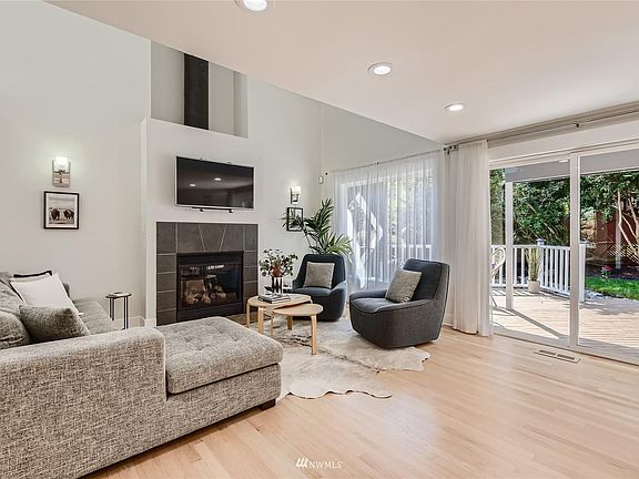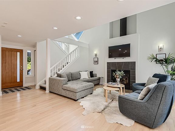 This bright, spacious & quiet home has been stunningly updated! Every surface has been redone - flooring, cabinets, mill work, doors, lighting & countertops! Main floor features living room with vaulted ceilings & gas fireplace, expansive kitchen with custom cabinets, gorgeous quartz countertops, tile backsplash, wine fridge and hardwood floors throughout. Spacious dining room looks onto fully fenced, peaceful & private backyard. Upstairs has highly coveted 3 bedrooms on same floor w/ XL primary suite with walk-in closet & ensuite bath. Deck off primary suite feature's view of the lake! 2 car garage as well as driveway for 2 additional cars, custom closet built-ins, tons of storage, close to Greenlake & shops on Phinney complete this home!