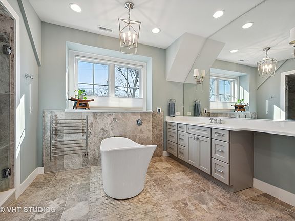 Custom modern farmhouse within walking distance to charming downtown Barrington. Enjoy local retail, coffee shops, dining, parks and Metra to downtown Chicago. Conveniently located to all schools; elementary, middle and high school. This home's curb appeal draws you into the welcoming and versatile main level. Beautiful hardwoods create cohesive and uninterrupted flooring throughout the first and second levels of the home. The kitchen offers luxurious finishes, an expansive island and high end appliances creating not only a stunning space, but a high functioning one as well. With a separate dining area, eat-in kitchen, cozy gathering place around the fire and welcoming family room, this floor plan offers so much flexibility. The sophisticated half bath for guests, an efficient mudroom and fifth en suite bedroom or in home office complete the main level. Four incredibly spacious bedrooms on the second floor all have plenty of closet space with custom organizers in each. The primary bedroom, with its vaulted ceilings, huge windows and exquisite bath with heated floors and towel warmer create a calming retreat. The open and extra wide stairwell leading to the finished basement with beautifully tiled flooring invites you to another level of living and recreational space. The secluded patio, newly reconstructed exterior fireplace, built-in gas grilling area and flat green yard with custom built raised garden beds is an outdoor oasis. The crossbuck rail fence encompassing the yard adds to the farmhouse charm. We look forward to showing you the amenities of this beautiful custom home.