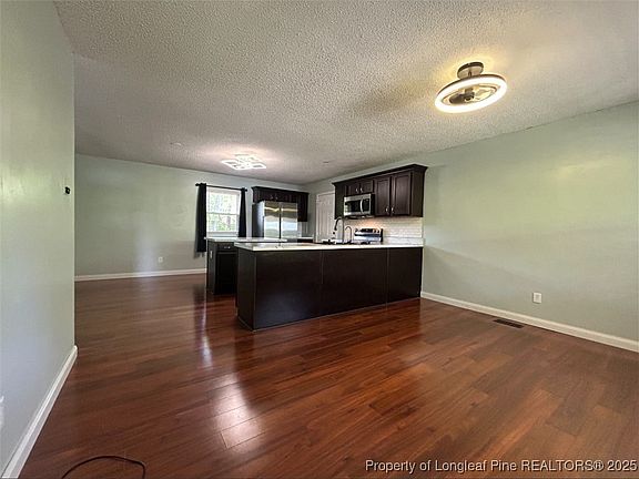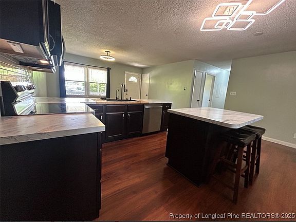 Welcome to Holly Hills in Spring Lake, NC! Nestled at the center of a quiet cul-de-sac, this charming ranch-style home offers 3 bedrooms, 2 full bathrooms, and just over 1,000 square feet of cozy living space. The open-concept layout connects a warm living area with hardwood floors to an eat-in kitchen featuring a generous island, bar seating, ample cabinets, nice countertops, and a classic subway tile backsplash—perfect for casual dining or entertaining.