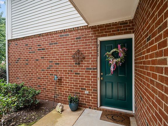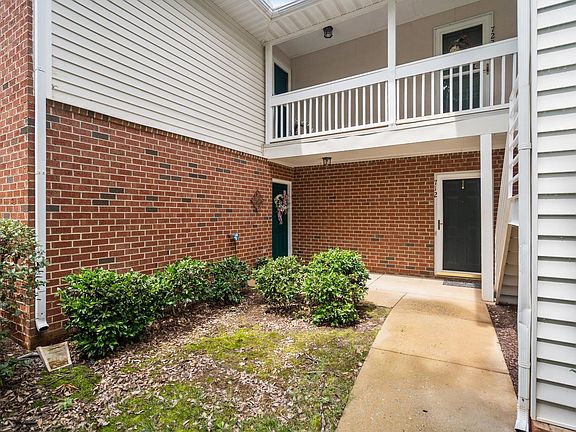 Well cared for 1st floor END UNIT CONDO! The Kitchen is open to the dining area and the family room and offers white raised panel cabinets with brushed nickel pulls, white countertops and appliances, plus 2 overhead light fixtures. Two spacious bedrooms both offer ceiling fans and walk-in closets! The family room features a ceiling fan with frosted globe light, gas log fireplace with slate surround and mantel with dentil trim. Two windows with blinds flank each side of the fireplace and have 2" faux wood blinds! Large laundry room offers white wall to wall raised panel cabinets with brushed nickel pulls. Relaxing covered patio surrounded by mature trees. Convenient location near hospital, major highways, shopping, greenway, parks with playground and much more! The HOA covers exterior maintenance, grounds maintenance, pool, water, sewer, basic cable, trash and yearly termite inspection. The HVAC unit is only 3 years old!