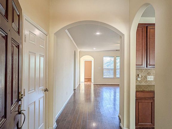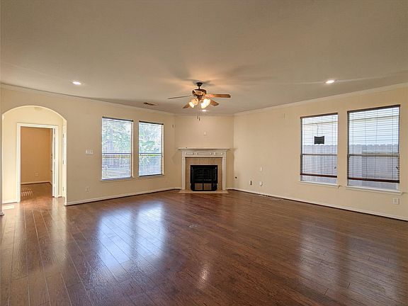 Charming one-story home on a quiet cul-de-sac, minutes from Hwy 59 and Brazos Town Center, easy access to shopping, restaurant, and movie theatre. No carpet! This former Taylor Morrison model home has lots of upgrades, with wood floors, ceiling fans in all the bedrooms and family room, gas/wood fireplace, high grade granite counter tops in kitchen. Cozy dining area has bay windows overlooking lush landscaping in front yard. Fridge, washer and dryer provided! Master bath has double sinks and separate shower and tub. Wood window blinds throughout the house. Community amenities include community center, swimming pool, splash park, and a recreation center with soccer, volleyball and basketball courts. Call today for a tour!