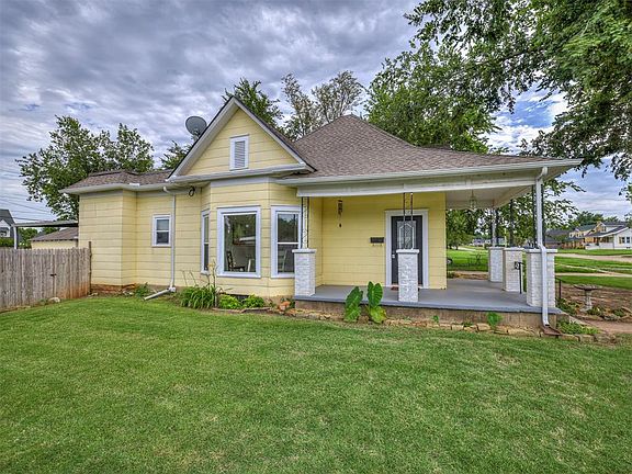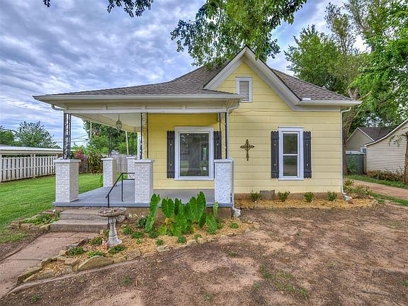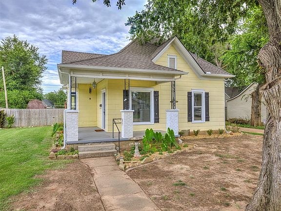 Fall in love with this sunshine cottage located in historic area of Kingfisher, minutes from downtown and walking distance to Heritage Elementary school, shopping and more. Sip coffee on the charming covered porch in the shade of beautiful mature trees. This property has 3 lots with private drive and detached garage. Updated windows, HVAC unit, carpet, and kitchen. Seller replaced electrical wiring and panel, installed gutters, new lighting, and replaced living room carpet. Living room has lots of light from a beautiful bay window. Master bedroom is spacious with large windows overlooking the backyard. This home has a great basement/storm shelter accessible from inside the house.