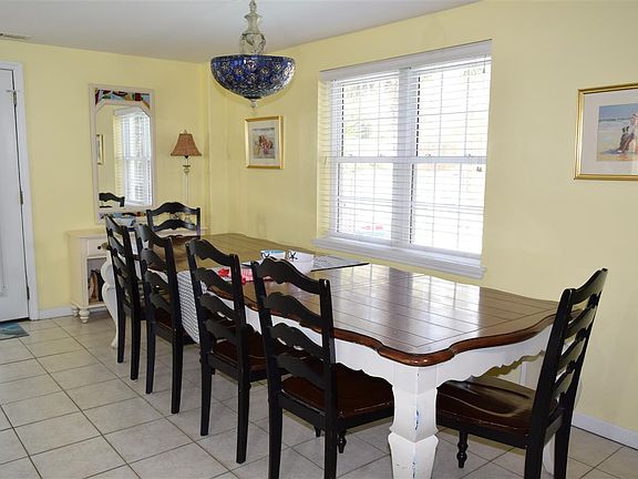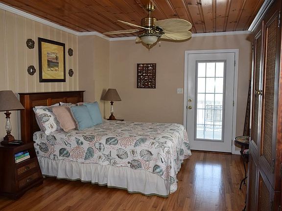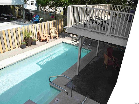 Charming 4 bed/3 bath home in rental zone with private pool and NO HOA! Gorgeous pine flooring and ceilings, recessed lighting, granite counters, stainless appliances, 2 pantries, open-concept kitchen/den/dining - comfortably seats 12! Huge Master Suite with sitting area opens onto TWO decks - wow! Master bath sports large tiled shower w/ 2 shower heads, separate toilet area, vanity and even a tv! Relax on the shaded patio swing and shaded dinette area around the 25 ft. pool, or sun bathe on the spacious 19 ft. deck overlooking sparkling blue water! Large laundry has closet and shelving - newly updated! Huge 13x9 storage can hold a golf cart + all your toys! Just ONE BLOCK TO OCEAN - make it your own and let the fun in the sun begin!