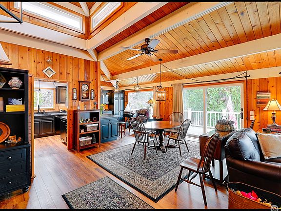 Enjoy fantastic sunsets & water views from your main level living custom-built lodge w/vaulted ceilings, fireplace, and large windows & skylights allowing the sun rays to penetrate the home w/an abundance of natural light. Live a vacation every day & enjoy the deck w/a sunny exposure & water views or host BBQ’s on the patio. The lower area is a finished family/multi-purpose room w/a full bath; bedroom; wet bar; refrigerator & private entrance. The home features an oversized 2-car garage w/shop area. The adjacent greenbelt enhances the property to provide privacy for the fully landscaped fenced yard. Community amenities; tennis & pickle ball, golf, club house, 2- pvt beaches, BBQ areas, and a marina with a boat ramp for your water pleasures.
