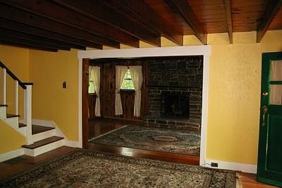 A country cottage! This charming house may look like a traditional colonial on the outside, but inside the exposed beams, the hardwood floors and stone fireplace provide a pleasing treat to the eye. A large entrance hall opens wide to a living room on the right and dining room on the left. Theres even a cozy bedroom on the first floor with a pretty stained-glass window facing the kitchen. Mercer tiles line the backsplash above the sink, and theres an antique hanging lamp in the dining room. A breezeway connects the kitchen to the garage and can serve as a sitting room. Not only does the oversized 3-car garage have a full workshop, but also an installed air compressor. A large storage shed as well as a vintage garden house enhance the property.