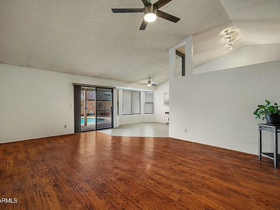 3 Bedroom, 2 bath + Bonus room ranch style home in a Non-HOA neighborhood. Double gate and extended concrete slab in front of gate is 47'9'' long x 13'7 wide for extra parking. Behind the gate has room for an RV, boat or trailer. Interior flooring is tile and laminate, no carpet in this home. Vaulted ceilings with plant shelves. Ceiling fans. Galley kitchen with granite tiles. Stainless Steel appliances. Built in microwave. The refrigerator stays. Bay window in the Dining area with silhouette shades. The primary bedroom has a wood accent wall and a slider to exit to the backyard for a late night swim. Primary bathroom has double sinks, step down tub/shower combination. Walk-in closet. Hall bathroom has a vessel sink, tub/shower combo with glass doors. Shutters in the secondary bedrooms. The Living Room has an 8' glass slider covered by cellular verticals. This backyard features and outside oasis: covered patio with 4 exterior roller shades with sun protecting fabric, swimming pool, 8 person above ground Diamondback spa, Free standing building that is a Wet/ Dry Sauna with shower (small water heater) Sauna runs on propane. Two large storage sheds (one with a skylight) Inside laundry with cabinets and Whirlpool Washer and Dryer that stay. Rheem Electric Water heater (2015) 4 Ton, 13 Seer Ruud AC unit installed in 05/2013. AC duct system was inspected, cleaned and sealed 04/2020. The hard start compressor was replaced 03/2023.