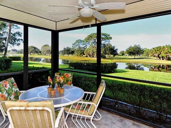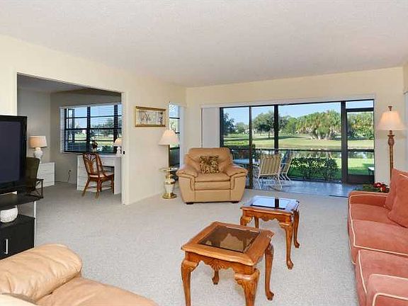 Rarely available 3 BR 2.5 BA ground floor split plan condominium with spectacular water and golf course views. Enjoy the sunsets from your spacious screened lanai which boasts hurricane shutters. This 1,627 air-conditioned square feet home is ideal for full-time or seasonal living. A beautifully remodeled kitchen includes new raised panel cabinetry with soft close deep drawers and pull-outs, granite countertops including breakfast bar, newer appliances, indirect lighting, ceiling fan, and more. The unit has beautiful and easy to care for flooring throughout. New HVAC and Humidistat installed in 2013. Nice and neutral window coverings. Well run association with friendly and helpful maintenance man on site. Unit is being sold turnkey furnished and completely move-in ready. Optional and private Palm Aire Country Club is just minutes away. The bustling University Parkway corridor, new mall, Benderson Aquatic Center, downtown Sarasota, and our white sandy beaches are all within short driving distances.