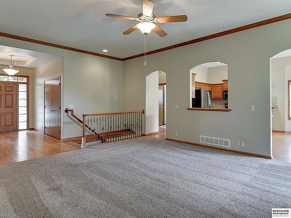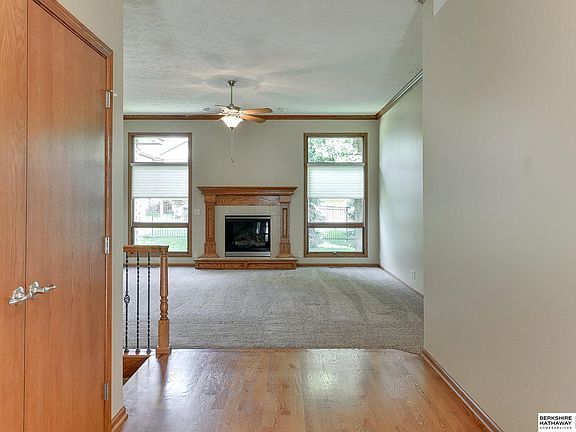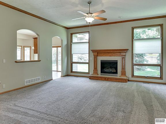Perfect ranch villa located in popular Cimarron Woods on quiet cul de sac. This home was a former Woodland Homes Concord model & features granite countertops, birch cabinets, crown moulding, two fireplaces, pantry, SS appliances & main floor laundry. Main floor includes large primary bedroom w/ huge walk-in closet, dual vanities, ceramic tile bath, jetted tub & shower as well as a 2nd bedroom & full bath. On the lower level, you'll find an enormous open rec room area w/fireplace and a 3/4 bath. A 3rd lower level bedroom w/egress window is framed & ready to finish if desired. East-facing patio is shady & cool in the afternoons & a full metal fence encloses the property. Best of all, you can enjoy maintenance-free living since the low monthly HOA fee covers snow removal & mowing. Roof & gutters replaced in 2023 along w/exterior paint. Home interior has been freshly painted last week and is ready for its new owners. All measurements approximate (AMA) per Sarpy Assessor