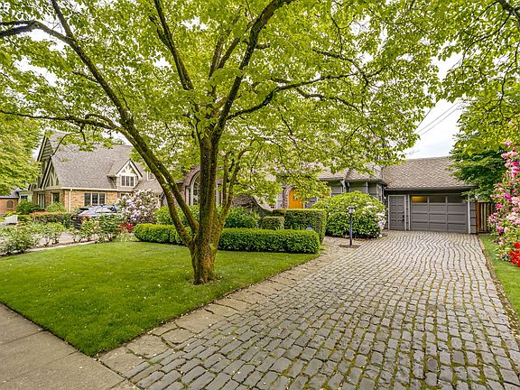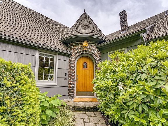 Perfectly situated along picturesque Reed College Place, this enchanting 3BD/3BA Tudor-style home blends fairytale charm with peaceful practicality. From the cobblestone driveway and cottage-style rolled gable roof to the beautiful masonry and swoon-worthy Batchelder fireplace, every detail evokes timeless English elegance. Arched cathedral leaded-glass windows complete the picture, creating an atmosphere as inviting as it is unique.Inside, the thoughtful layout offers both comfort and flexibility. Two bedrooms on the main floor provide easy living, while the upstairs primary suite is a serene retreat featuring a custom walk-in closet and ensuite bath with heated floors. The formal living and dining rooms are ideal for entertaining, while the spacious kitchen—complete with breakfast nook and built-ins—adds both style and function. The lower level includes a separate family room and bonus room perfect for a home office or guest space, plus full bathroom.Additional highlights include a two-car garage with shop space and a newly added detached studio in back —ideal for art, work, or quiet retreat.Recent updates elevate the home's appeal, including designer tile in the bathrooms and kitchen, a high-end Gaggenau stovetop, and freshly refinished hardwood floors in the kitchen. The backyard is an elegant, private oasis featuring a covered patio, brick pavers, hardwood decking, and a hot tub—perfect for relaxing or entertaining. Wisteria blooms, mature trees, and curated landscaping offer lush privacy in the rear, while the front yard opens to sweeping views of the boulevard and a warm, welcoming community a short distance from beloved Duniway Elementary. This is more than a home—it’s a lifestyle steeped in charm, character, and classic Portland beauty.