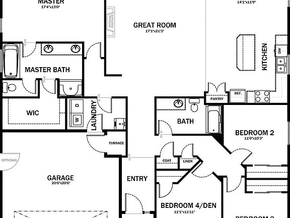 Spacious Comfort!With two beautiful exterior elevations to choose from, this 2012 sqft, 4 bedrooms, 2 bath plan is well-designed with all the space and convenience you're looking for. Just off the entry, the fourth bedroom can be a flex room, great for a computer room or den. A spacious great room opens to the kitchen and dining area, creating a welcoming space for guests and family. The kitchen features a generous amount of cabinetry, a pantry and a large island with breakfast bar or choose an optional angled island with walk-in pantry. The master suite includes a full, private bath and walk-in closet, giving you ample room to relax.
