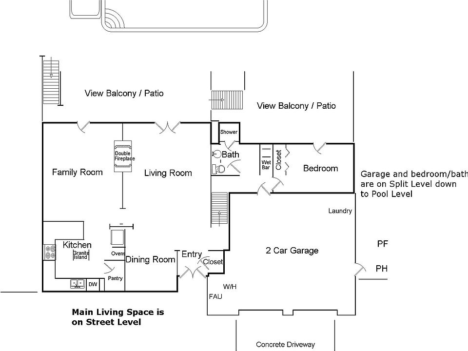 Entertainers Dream inside and out. Open living room and dining area (currently used as sitting area). This is a cooks Kitchen: 4 burner Wolf cook top/hood, Viking double ovens, GE refrigerator, & Granite island with sink. Updated cabinets & tons of storage. Kitchen opens to breakfast bar and family room. Double sided Fireplace in Living Room/Family Room. Split level balcony to enjoy view. Split level up to master bedroom, master bath, guest BA, & 2 large bedrooms (one used as office). Split level down to guest bedroom and bath (all on pool level). The pool has been completely redone with decking, salt water system, pool equipment, two remote controls and night mood lighting. Removable pool safety fence. The BBQ entertainment area has bar with stools (that stay), mini frig and sink with hot and cold running water. Cool at night? Start up the outdoor fire pit. For parking, you have a circular driveway, and an over sized two car garage. The laundry facilities are in the garage. Must see to appreciate.