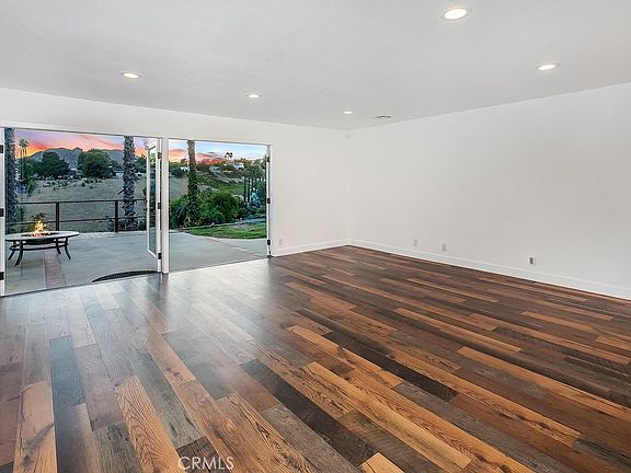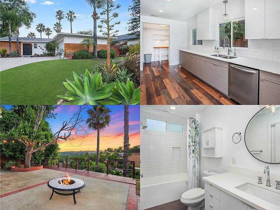 PANORAMIC VIEWS OF THE VALLEY, HILLS, MOUNTAINS, SUNSETS AND CITY LIGHTS! Beautifully remodeled. Living room drenched in natural light and enhanced by recessed/dimmable LED lights, double French doors that highlight incredible sunsets as they descend behind El Scorpion Peak and wood laminate floors. Remodeled kitchen with sleek white cabinetry, soft-close hardware, quartz countertops, subway tile backsplash, undermount dual basin stainless-steel sink, stylish glass globe drop-down lighting, stainless-steel Frigidaire appliances which include a 5-burner gas range, built-in microwave oven, dishwasher, and French door refrigerator and wood laminate floors. New frosted glass French doors open to reveal a butler’s pantry/laundry room with storage, under-cabinet motion detecting lights, butcher block folding table, frontload washer/dryer on pedestal and service entry. Dining room with modern rough hewn wood accent wall, gold-toned chandelier and French doors that frame incredible valley views. Primary suite is bathed in natural light and enriched by double French doors that lead to the backyard patio and frame stunning valley views, lighted ceiling fan, dual wall-to-wall closets, mirrored wardrobe doors and gleaming wood laminate floors; plus, a remodeled en suite bathroom with floating white vanity, quartz countertops, undermount basin, glass globe accent lighting, tiled tub/shower bidet, light switch with LED nightlight and fan on timer and custom hexagonal tile floor. 2 additional bright and airy bedrooms with sparkling windows, elegant glass lighting, mirrored wardrobe doors and wood laminate floors. One bedroom with direct garage access and one with convenient en suite guest bathroom access. Remodeled guest bathroom with modern quartz crowned floating vanity, undermount basin, glass globe accent lighting, frameless glass enclosed custom tiled step-in shower, light switch with LED nightlight and fan on timer and tile floors. Nest thermostat. Ring doorbell. Sprinkler and drip system on timer. Side yard motion detection lighting. Backyard with PANORAMIC VIEWS OF THE VALLEY, HILLS, MOUNTAINS, SUNSETS AND CITY LIGHTS, open patio, scenic wood deck, misting system, ambient LED lighting, tall shade tree, colorful flowerbeds and swaying palms. Located in a highly sought-after school district that offers specialty programs. Moments from hiking trails, West Hills Hospital/Medical Center, Fallbrook Mall, Westfield Topanga, The Village outdoor mall and restaurants.