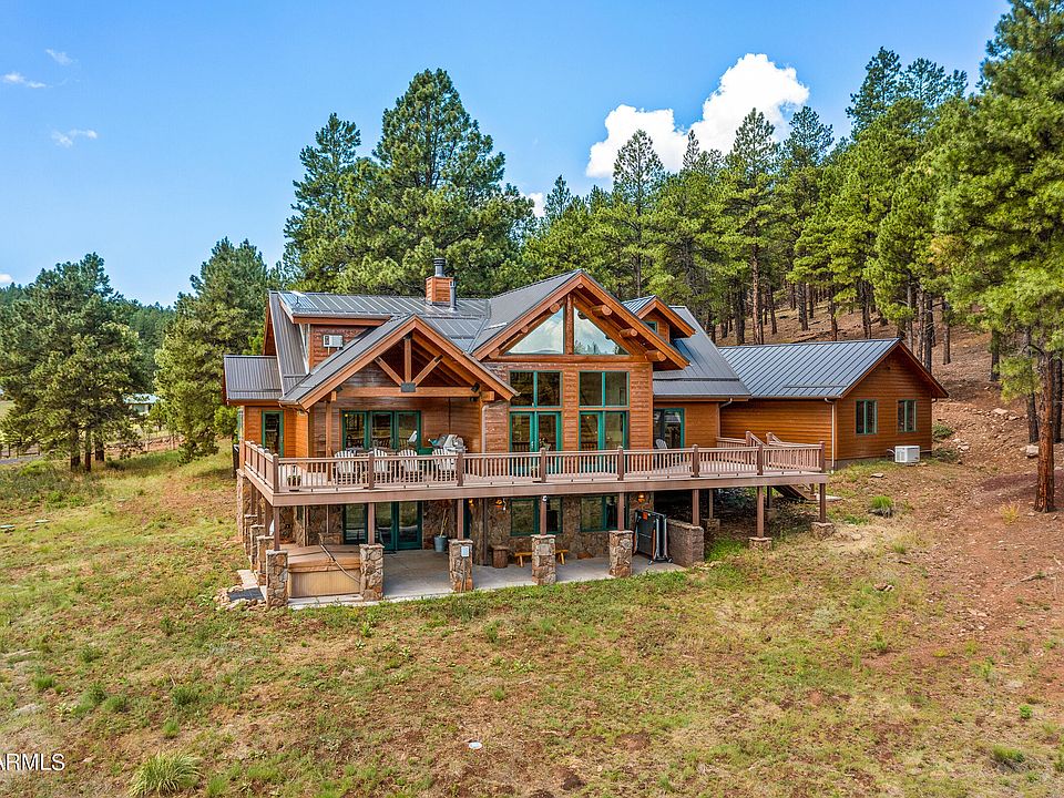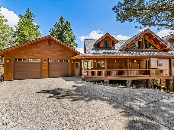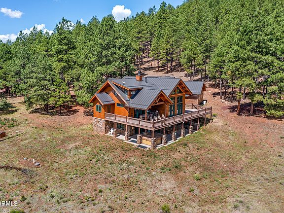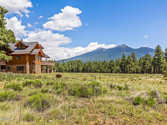 Pristine mountain retreat with acres of forested land and spectacular views. This 10-acre estate, located near Snowbowl, nestled back into a hillside, offers a true getaway, with encompassing vistas of the San Francisco Peaks. Property allows for four horses, great summer relief. The private drive winds to a detached 2-car garage and covered patio, leading to the main living area and the inspiring view of the Peaks beyond. A gas rock-faced fireplace graces both the living room and dining room, creating a welcoming and relaxing space. Open log beams and vaulted ceilings lend toward a true cabin feel and you'll stay comfortable on the chilliest mountain nights with radiant floor heating. Just off the dining and living area, the kitchen is complete with built-in appliances, 5-top gas stove and breakfast nook, as well as easy access to the covered and uncovered composite deck. With a powder room and laundry room on the main level, as well as the en suite primary, this home is thoughtfully designed for single-level living. In addition, there are upper and lower levels, the upper level has another living space in a peaked loft, 2 bedrooms and a full bath. The lower level has a large family room/game room with 2 additional bedrooms and another full bath, as well as access to the lower deck level, offering another covered outdoor living space to unwind and watch the changing light and clouds over the Peaks. A metal roof installed in 2021, a reliable private well, and a Generac generator all offer dependable resources and power under any circumstances. The land itself offers many versions of what makes the mountains so special, with prairie, forest, flat and hilly terrain. This is truly an incredible property. Don't forget the horses. You may have up to 4 horses per 10 acres.